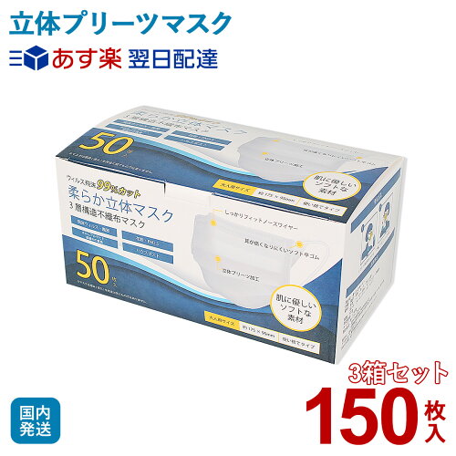 マスク 在庫あり 150枚 箱 3箱セット 不織布 セット 99%カット 衛生 使い捨て 三層構造 大人用サイズ ウイルス 花粉 防塵 飛沫感染 PM2.5 風邪 ハウスダスト 男女兼用 箱 衛生用品 立体 プリーツ ホワイト 白 【返品不可】